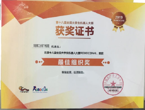 我校机器人一队和二队(华广机器人野狼队)联合组队参赛,经过长达10个月的机器人设计、调试、优化,在南方赛区中突围顺利晋级全国总决赛,并在总决赛中获得二等奖。在机器人马术比赛中,我校代表队所设计的四足马速度快和灵活,获马术竞速赛第2名,一等奖,获绕桩赛二等奖,全能赛二等奖。