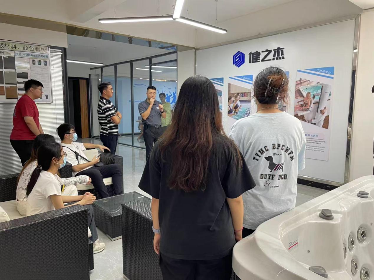 在工业设计教研室主任梁文峻、教师陈默与邓道锋的组织下,2021级智能产品设计方向的学生们参观了健之杰公司的展厅,了解了该公司在按摩浴缸和水疗设备行业的最新设计成果和产品系列。展厅中陈列的产品设备引起了大家的极大兴趣,特别是公司如何通过产品设计提升用户体验,增加产品附加值等方面的创新让学生们深受启发。