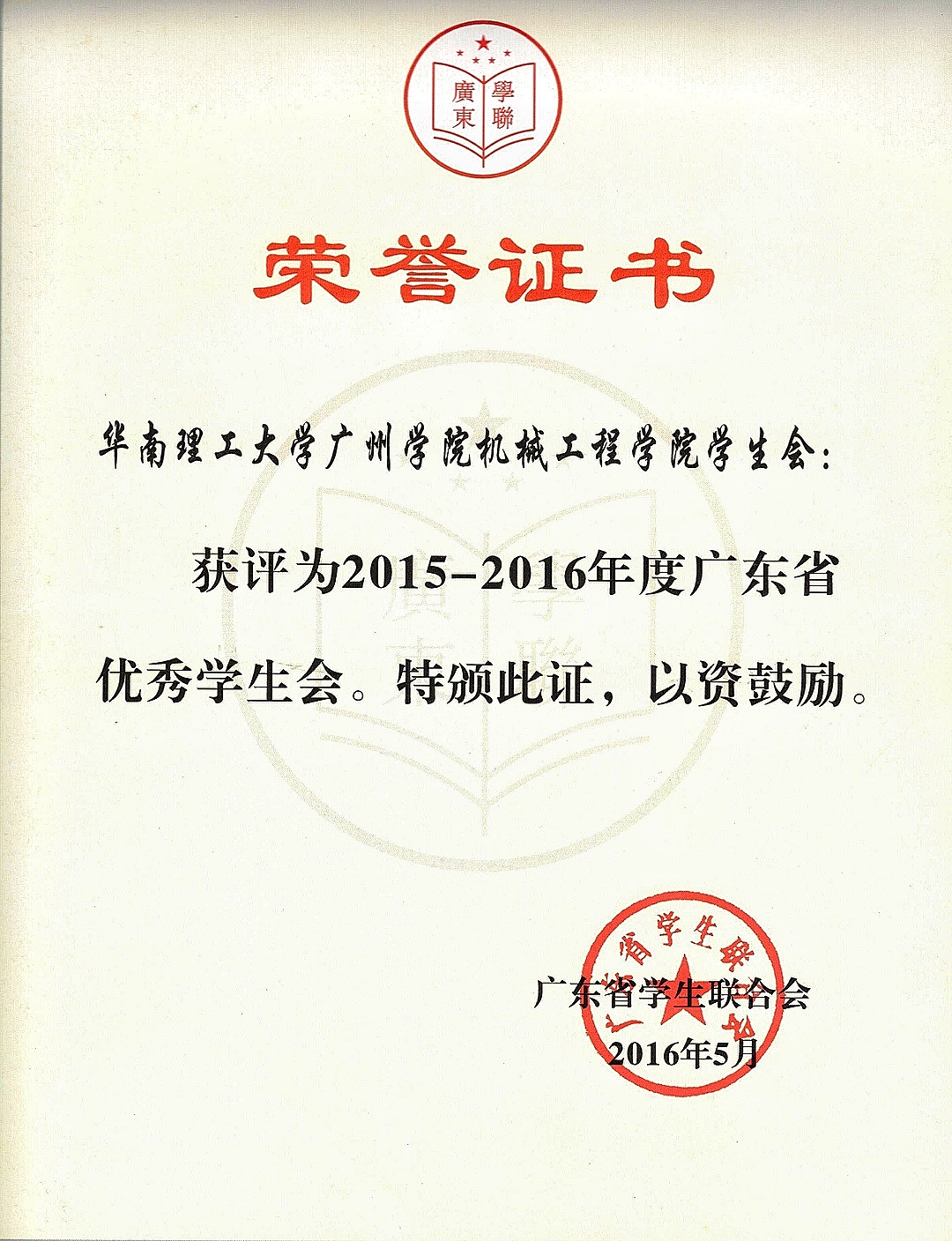 广东省优秀学生会荣誉证书