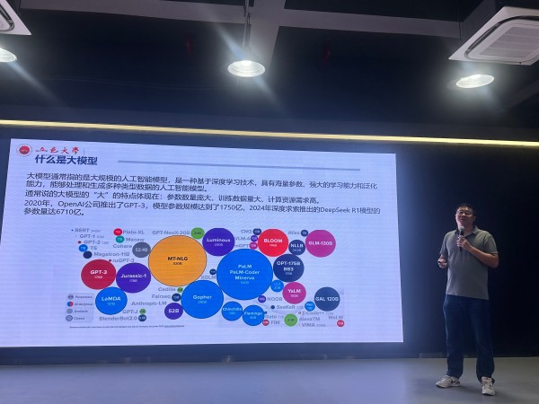 五邑大学创新创业学院常务副院长、科技处副处长黄辉围绕五邑大学现代产业学院建设和创新创业教育,介绍大模型特点,列举 GPT-3、DeepSeek R1 等模型参数规模,讲解产业技术创新产业链和人工智能深度学习框架,分享校企共建实训基地、推动学生参与真实项目的经验,为学院产教融合提供了借鉴。