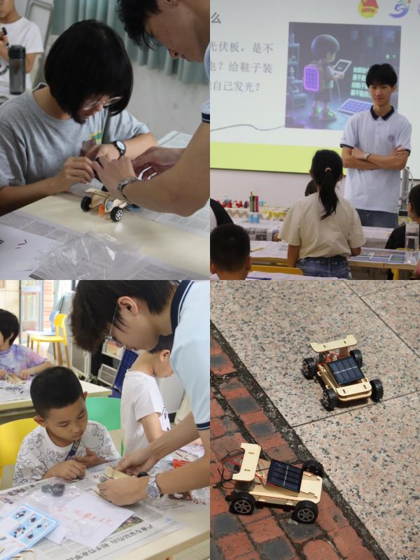 第二天的实践环节将活动推向高潮。孩子们分组组装光伏小车,在团队成员指导下完成电路连接、机械组装等工序。当一辆辆小车在阳光下开始运行时,现场响起阵阵欢呼。活动还设置了“光伏知识竞赛”环节,通过趣味问答巩固学习成果,最终评选出10名"光伏小达人"。