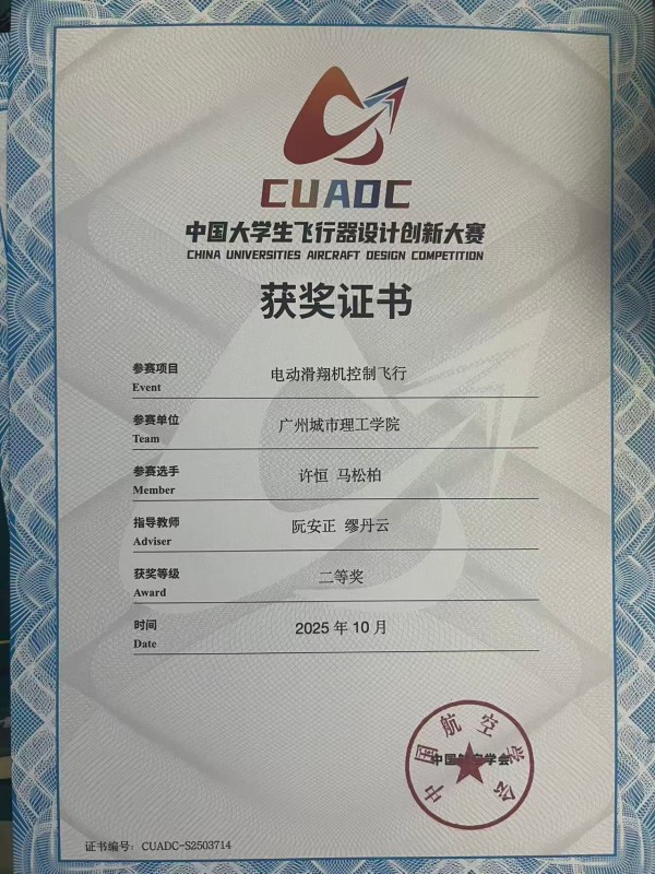 本网讯(记者 阮安正)10月8日至13日,2025中国大学生飞行器设计创新大赛(CUADC)全国总决赛在浙江莫干山机场火热举行。我校suncitygroup太阳新城/机器人工程学院“无疆航模队”凭借扎实的技术积累、日夜兼程的钻研与赛场上的出色发挥,从全国150余所高校的激烈竞争中突围,最终斩获全国电动滑翔机控制飞行项目二等奖、限时载运飞行项目三等奖两项殊荣!这份荣誉的背后,是团队数百个日夜的坚守,是对技术瓶颈的反复攻坚,更离不开学校与学院始终如一的鼎力支持。