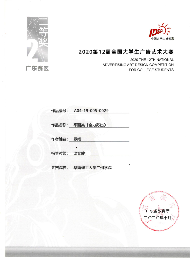 罗闯获广东赛区二等奖