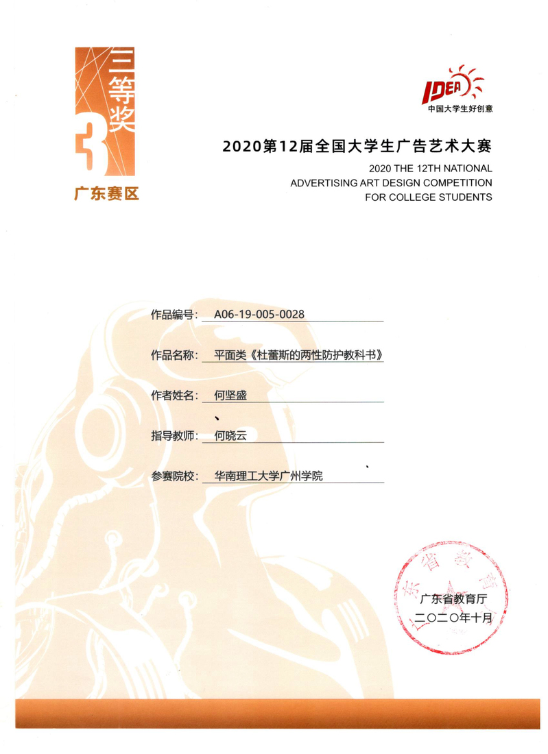 何坚盛获广东赛区三等奖