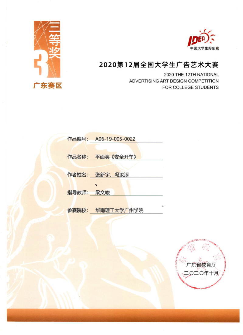 张新宇、冯汝添获广东赛区三等奖