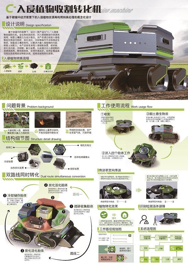 由工业设计教研室教师指导的2021级学生邓婉怡、李莉林和梁萧组成的学科竞赛团队先后获得非命题赛场广东赛区二等奖、非命题赛场国赛一等奖。学生回顾比赛的准备过程,并介绍了作品的由来。最开始先明确了设计初衷,由于入侵植物不仅破坏当地生态环境,还影响农作物的生长,所以团队就想设计一款能够高效、环保地处理这些入侵植物的机器。其次,机器需要同时平衡功能性和美观性。设计这款大型器械并不是一件容易的事,首先考虑的是它的功能性,要能够高效地收割入侵植物,还能将这些植物转化为有用的资源。经过多次讨论,团队最终确定了结构和工作原理。在外观上,注重实用性和美观性相结合。机器不仅能够高效地收割入侵植物,还能将它们转化为有机肥料,真正实现资源的循环利用。后来,指导老师鼓励成员们应对自己的作品保持自信,勇敢的去投比赛。对作品要不断打磨,优化细节,不断进步。经过大家共同的努力,终于收获成果。