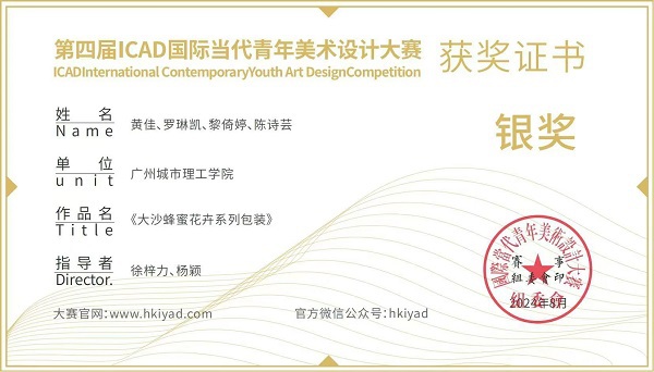 在第四届ICAD国际当代青年美术设计大赛中,学生们的作品涵盖了标识设计、文创设计、视觉传达设计等多个领域。他们的作品不仅在设计理念上具有创新性,而且在实用性和美学上也达到了国际水准。经过激烈的角逐,由徐梓力、杨颖两位老师指导,黄佳、黎倚婷、陈诗芸、罗琳凯四位同学组成的团队作品《大沙蜂蜜花卉系列包装》《浔桂--中山市五桂山蜂蜜包装设计》以及《与潮生--海宁市乡村民宿品牌视觉设计》均获得了铜奖。
