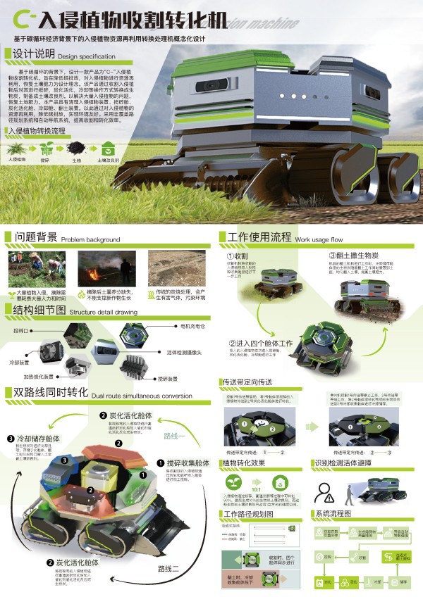《C-入侵植物收割转化机》作品由梁文峻老师指导,李莉林、梁萧、邓婉怡三位学生共同完成。设计团队研究了如何有效控制入侵植物对本地生态系统的威胁,并将收割的植物转化为有价值的能源或其他资源,推动资源的可持续利用。该作品在广东省赛区获三等奖。