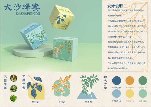 《大沙蜂蜜——蜂蜜品牌视觉包装设计》作品由徐梓力老师指导,罗琳凯、黎倚婷、陈诗芸、黄佳四位同学共同完成。设计团队深入研究了大沙蜂蜜的品牌特性,结合现代视觉设计趋势,创作出既具品牌识别度又有创意的包装设计。该作品在广东省赛区获二等奖,并在全国总决赛中获三等奖。