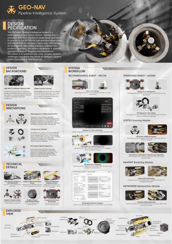 此次获奖作品由工业设计教研室冯颖老师指导,学生林荣鑫创作,《“经纬”管道智能运维双体系统》(GEO-NAV Pipeline Intelligence System)是一项针对城市地下基础设施维护难题的创新解决方案。针对传统管道运维中存在的“人工高风险、单一机器人功能受限”等痛点,林荣鑫提出了一种“异构双体协同”的作业模式——系统由负责高精度勘察诊断的“经”(RECON)机器人与负责重型修复作业的“纬”(MODEX)机器人组成。